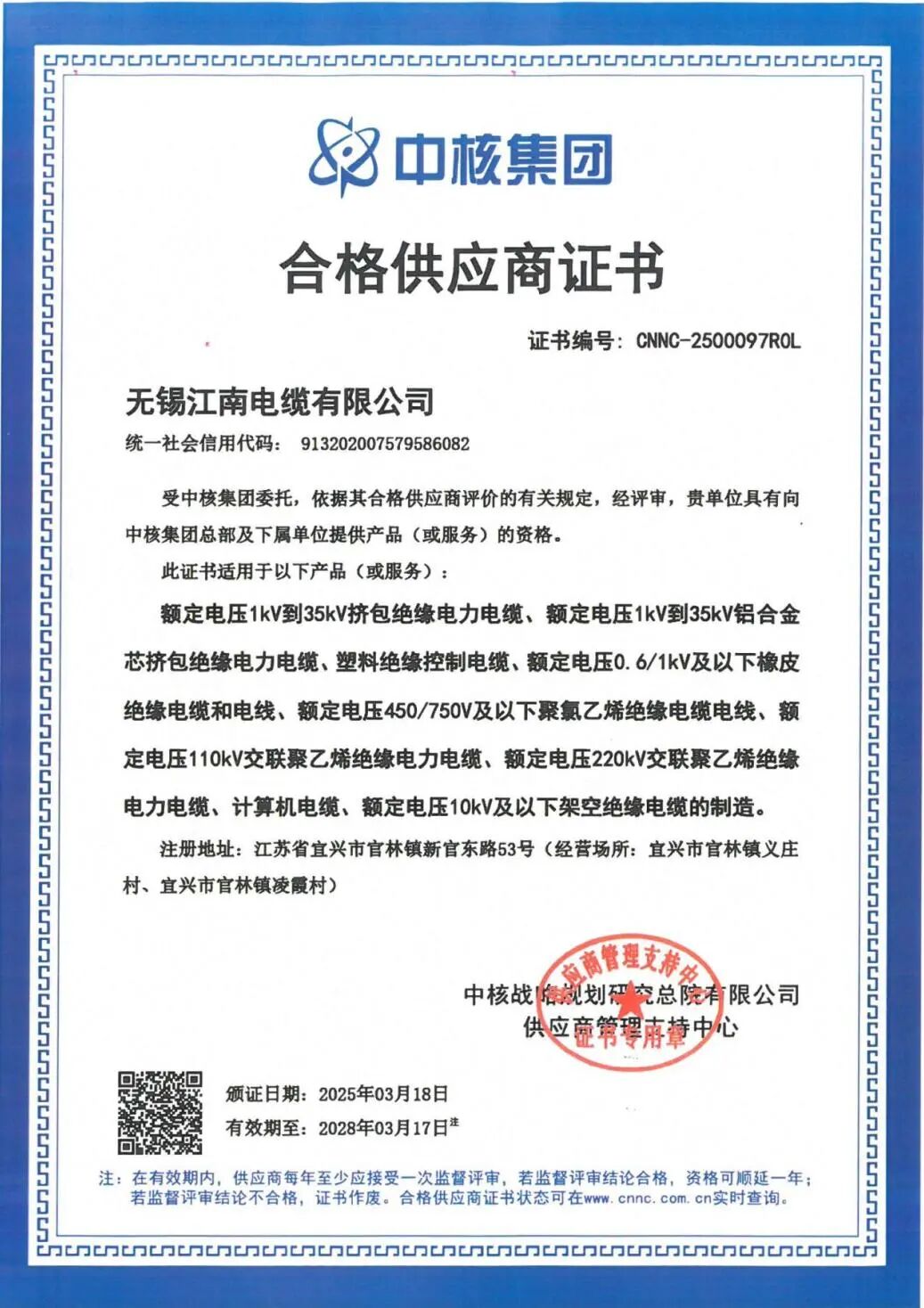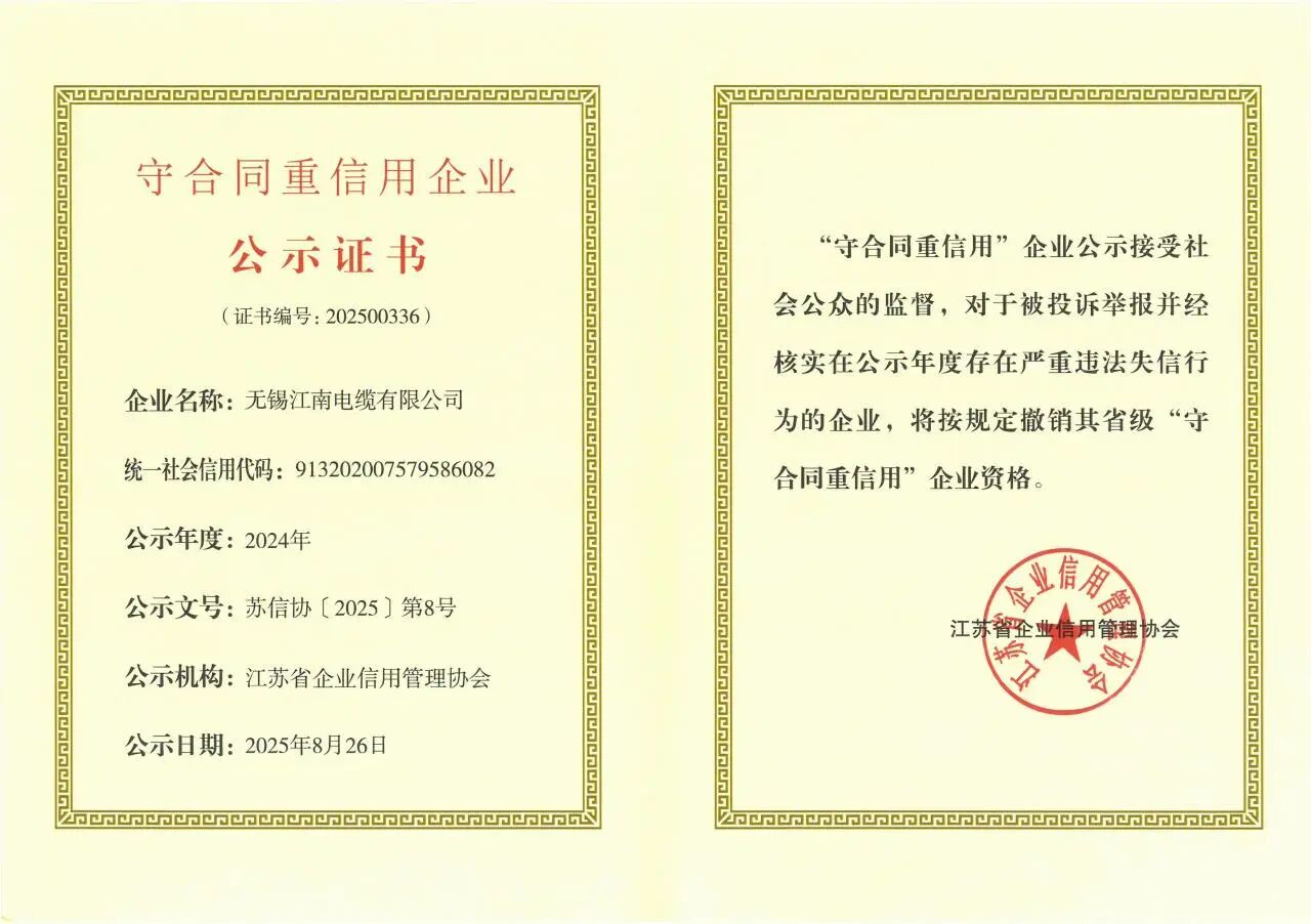近日,江蘇省企業(yè)信用管理協(xié)會發(fā)布2024年度省級“守合同重信用”公示企業(yè)名單,江南電纜再次獲評“省級守合同重信用”企業(yè)。